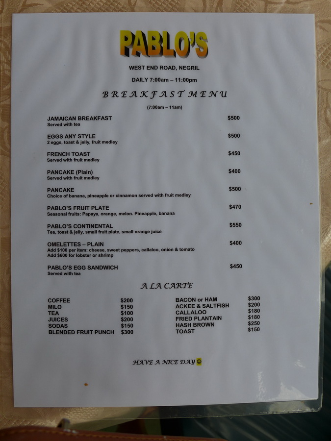 » Ямайка (Jamaica). Pablo's Restaurant Menu - Ямайка Доллар. Samsara Cliff Resort.