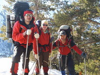 На спуске Игорь Викторович с Радионом смело глиссирует по фирну, но спуск оказался очень крутым. Группа сначала спускалась, пробивая тропу с корке снега, но потом следуя примеру поехали на ногах, а остальные – на чем пришлось. Отчаянных оказалось не много. Спуск был затяжным, спускались дольше чем поднимались. В итоге не расчитав свои силы и не имея опыта подобных спусков Вика сильно ушибла ногу неудачно остановившись о снежную глыбу, встал вопрос о снятии ее с маршрута. Настроение скисло. Дальнейший путь сильн замедлился в виду эвакуации Вики. Путь идет по несложной лавине давно сошедшей и местами вытаевшей. Несколько лет назад, когда лавны не было, спуск был куда как сложнее нынешнего. Лавины в этом месте видимо не редкость, т.к. в самом низу спуска был такой лесоповал, что невозможно стало идти. Спустились мы в лес, какой-то сказочный, вызывающий детский восторг. В лесу, возле ручья, сделали привал и перекус.